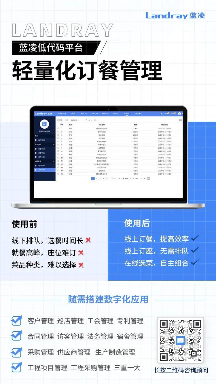 蓝凌低代码平台,数字化应用随需搭建,让更多新应用触手可得。不仅可以搭建订餐管理,众多企业通过蓝凌低代码构建了智慧党建、三重一大、客户管理、合同管理、采购管理工程管理、招标管理、租赁管理宿舍管理、门店管理等应用。
