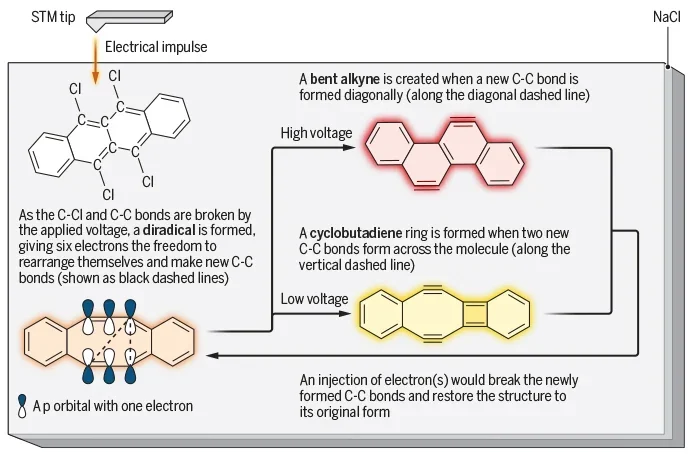 研究人员解释说,他们首先将样品材料放入扫描隧道显微镜内,然后再破坏特定的键。更具体而言,他们首先从四环化合物的核心提取四个氯原子作为起始分子,随后将扫描隧道显微镜的尖端移到一个碳(C)—氯(Cl)键上,用电破坏原子键。对其他碳—氯键和碳—碳键这样做会形成一个双自由基,留下6个自由电子,这些自由电子可形成新键。