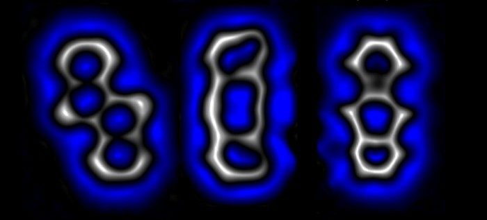 在扫描探针显微镜尖端施加电压脉冲,可以选择性地、可逆地将中间的分子结构转变为右侧或左侧的结构。 图片来源:里奥·格罗斯/IBM