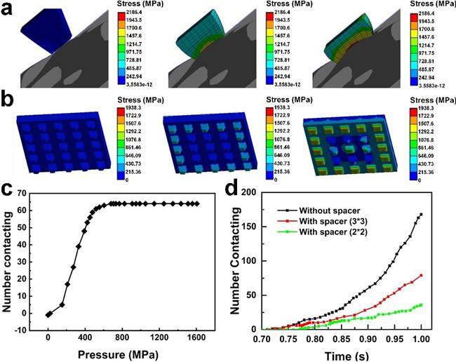 研究人员利用传统微纳加工工艺、真空镀膜技术和激光划线工艺制备出顶部为微圆台结构的聚二甲基硅氧烷(PDMS)/掺铝氧化锌(AZO)、间隔层为光刻胶(PS)和底部叉指电极为聚酰亚胺(PI)/金(Au)的柔性压力传感器。所制备的器件拥有高达2200 kPa-1的灵敏度、宽达9.6 kPa的动态线性量程范围,快至低于20 ms的上升和下降响应时间等优异性能。研究人员还进一步从理论角度阐明了器件在外界压力作用下的工作机理和内在压力分布,解释了PS间隔层中空穴直径大小、导电层微结构与最终器件灵敏度、动态线性量程范围和灵敏阈值等性能的关系。