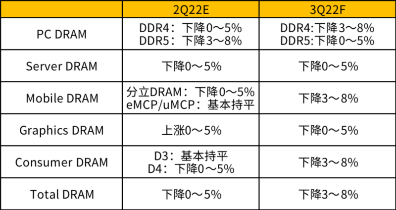 据TrendForce预估,2022年第三季DRAM价格将下跌3-8%,server DRAM将再下跌0-5%,Mobile DRAM跌幅扩大至3-8%,graphics DRAM价格仍小跌0-5%,Consumer DRAM中DDR3与DDR4价格将季减3-8%。