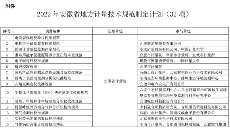 安徽省市场监管局下达2022年安徽省地方计量技术规范制定计划。依据《安徽省地方计量检定规程/校准规范制修订工作办理程序》(皖质办发〔2016)
