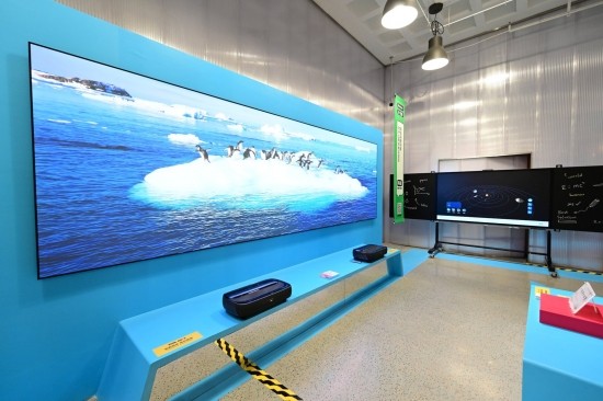 本次展览除了包含城市云脑、超声HD60、智能疫苗冰箱等服务于城市和居民的产品,也设置很多有趣的产品展项。比如可乐冰沙机,仅用8秒就可以把可乐变成冰沙;海信智慧黑板,让老师可以在屏幕上就完成粉笔板书的书写;两台120L9F海信激光电视拼接成超过200吋屏幕,这可能青岛最大的一台电视……