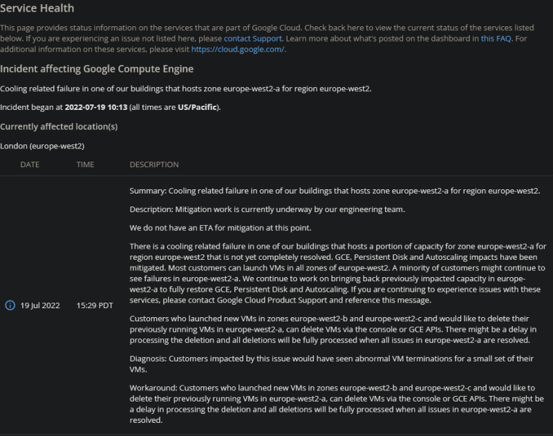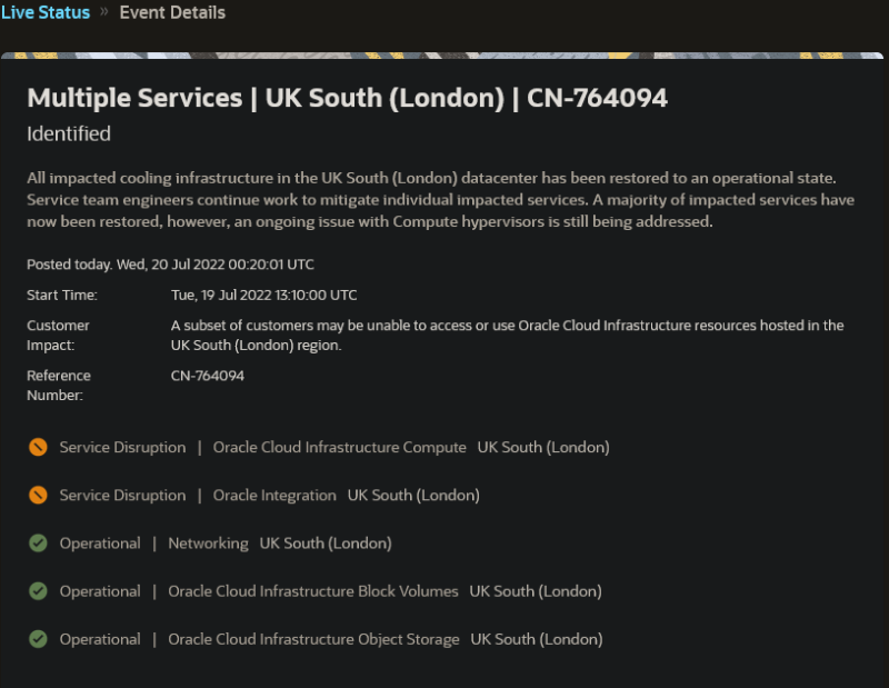 甲骨文在其状态页面上向客户发出了类似的信息,但直接将英国的“非季节性气温”列为停电的原因。该软件公司今天早些时候关闭了一些机器以防止系统故障,但其最新更新表明服务正在慢慢恢复在线。甲骨文表示,数据中心的温度“已经达到了可以工作的水平”,但它仍在努力修复其冷却系统。