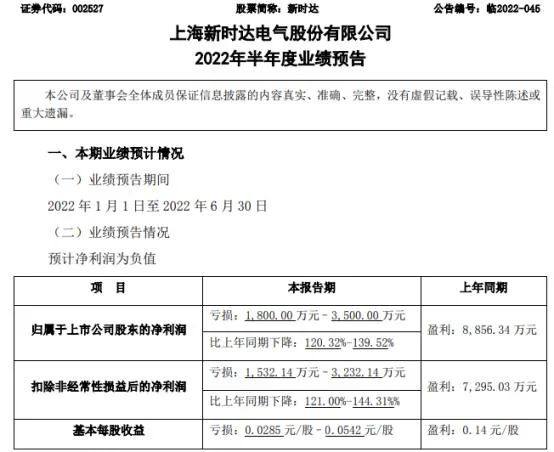 近日,新时达发布2022年半年度业绩预告,报告期内归属于上市公司股东的净利润亏损1,800.00万元–3,500.00万元,较上年同期由盈转亏,上年同期为盈利8856.34万元。