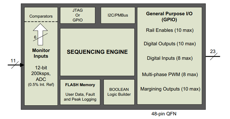 UCD9090A 是一款 10 轨 PMBus/I 2 C 可寻址电源定序器和AD9923ABBCZ监视器。该器件集成了一个 12 位 ADC,用于监控多达 10 个电源电压输入。23 个 GPIO 引脚可用于电源使能、上电复位信号、外部中断、级联或其他系统功能。其中 10 个引脚提供 PWM 功能。使用这些引脚,UCD9090A 提供对裕度和通用 PWM 功能的支持。