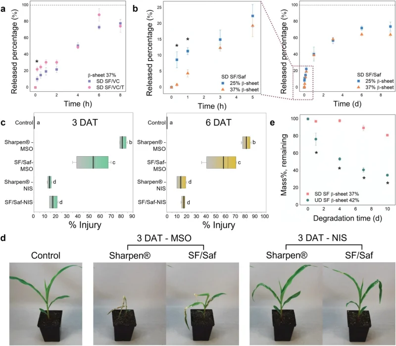 该团队在实验室中使用现有的基于喷雾的制造设备测试了蚕丝涂层材料,以制造一种包含在蚕丝胶囊中的除草剂,这种胶囊可以溶解在水中,随着时间的推移释放产品。当在温室中对玉米进行测试时,蚕丝包裹的除草剂与现有产品一样好用,但却大大减少了作物损害--降至0.8%,而没有包裹的除草剂则为25%。
