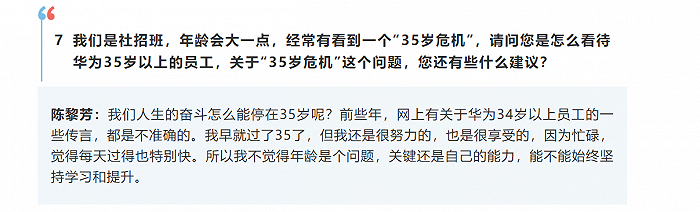 对于社招员工提出的“35岁危机”,陈黎芳称:我们人生的奋斗怎么能停在35岁呢?此前对于“华为34岁以上员工”的传言不准确。