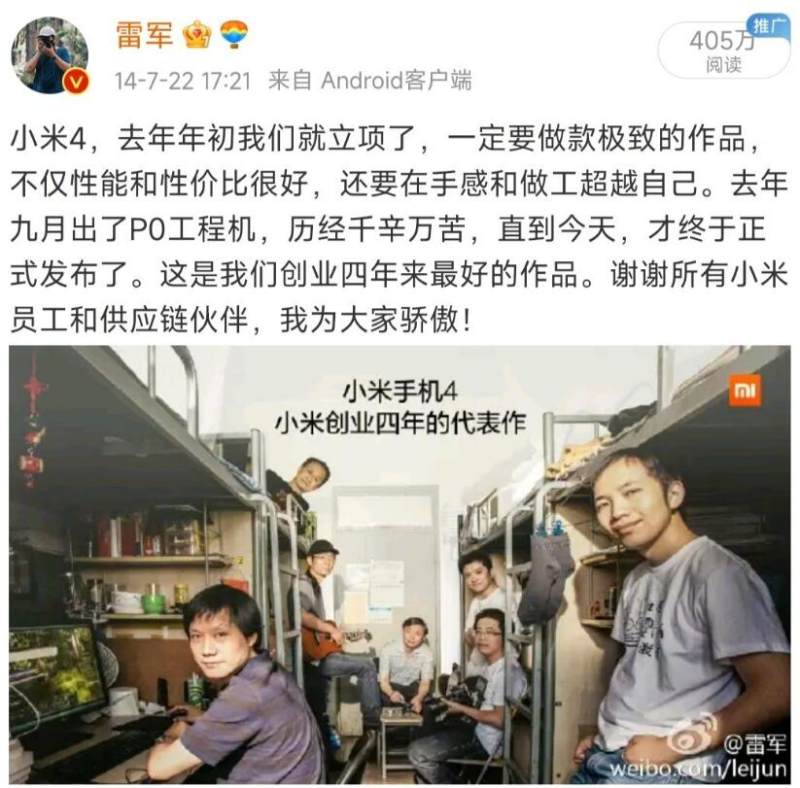 小米4,去年年初我们就立项了,一定要做款极致的作品,不仅性能和性价比很好,还要在手感和做工超越自己。去年九月出了PO工程机,历经千辛万苦,直到今天,才终于正式公布了。这是我们创业四年来最好的作品。谢谢所有小米员工和供应链伙伴,我为大家骄傲!