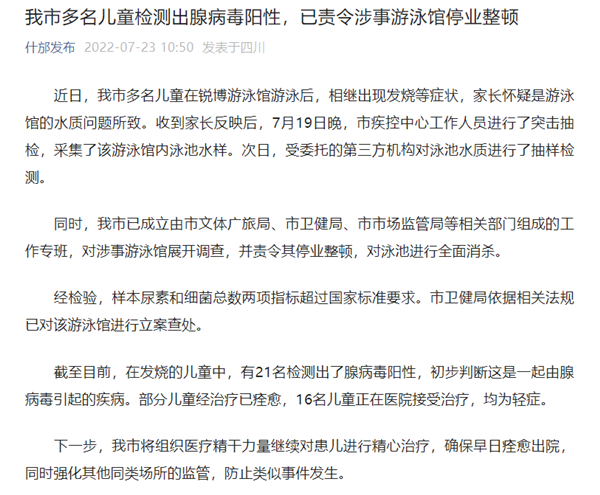 据“什邡发布”官方通报,近日,四川什邡市21名儿童发烧并检出腺病毒阳性,原因是游泳馆水质存在问题。