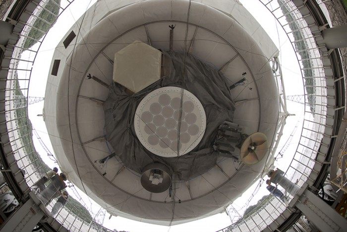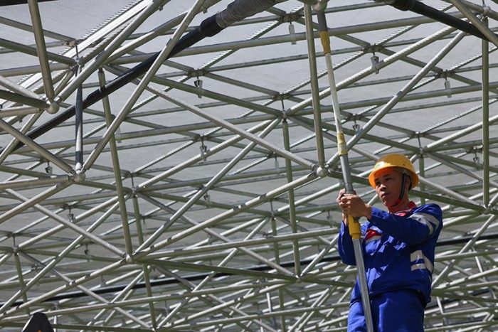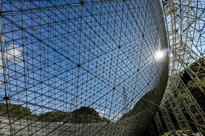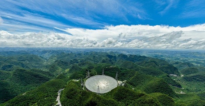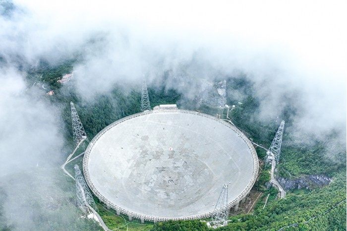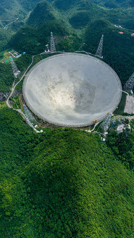 FAST位于贵州省平塘县的一处喀斯特洼地中,占地面积约30个足球场大,天顶覆盖角度为40°,工作频率为70MHz-3GHz。