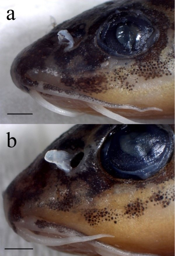 杨氏迷鳅头部侧面(a为雄性,b为雌性)。