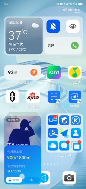 从他晒出的花粉桌面录屏画面可以看到,HarmonyOS 3上的万能卡片自定义程度非常高,还可以组合、堆叠各种不同的卡片,比如喝水提醒、时间日期、便捷搜索等等,可以根据自己的使用习惯随意堆叠。