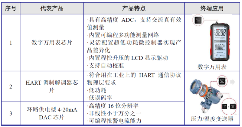据了解,晶华微的工控仪表类芯片主要有数字万用表芯片、HART调制解调器芯片、环路供电型4-20mA DAC芯片、压力/温度传感器信号调理及变送输出专用芯片四大类,主要应用在数字万用表、压力变送器、温度变送器、流量计等工业领域。