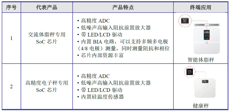 “公司医疗健康SoC芯片是基于高精度ADC的信号处理SoC技术,包括红外测温信号处理芯片、智能健康衡器SoC芯片、人体健康参数测量专用SoC芯片等,广泛应用于红外测温枪、体脂秤、健康秤、血压计、血氧计等各类医疗健康产品中。” 罗伟绍对芯八哥记者说道。