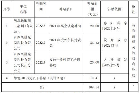 其中,江西凤凰光学科技有限公司是公司全资子公司,凤凰新能源(惠州)有限公司是公司的控股子公司。根据《企业会计准则第 16 号——政府补助》的有关规定,凤凰光学确认上述政府补助为与收益相关,全额计入营业外收入或其他收益,上述收到的政府补助将对凤凰光学的利润产生一定影响。