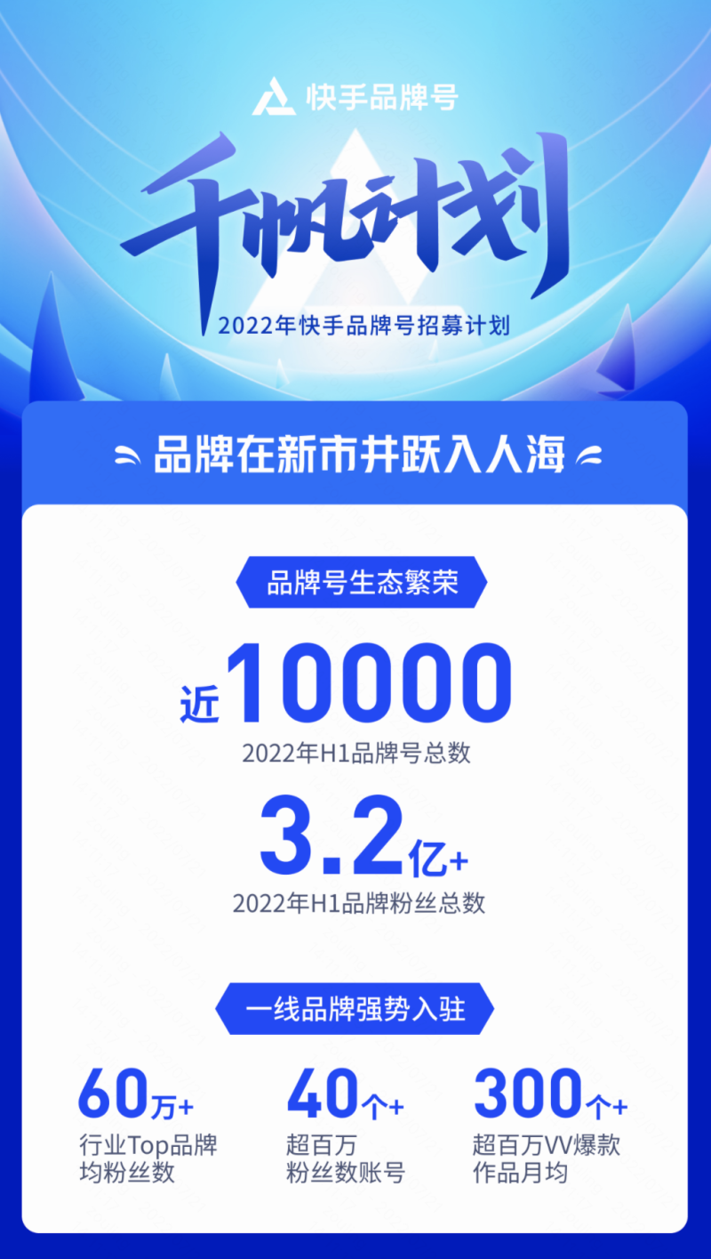品牌只要通过企业蓝 V 认证、拥有完整品牌资质,且账号粉丝量小于 10 万,即符合“千帆计划”品牌合作准入门槛,有机会享受从 2022 年 7 月至 12 月共 6 个月的长周期扶持。在“千帆计划”的助力下,快手将持续打造品牌号新生态,帮助更多品牌在新市井扬帆起航。