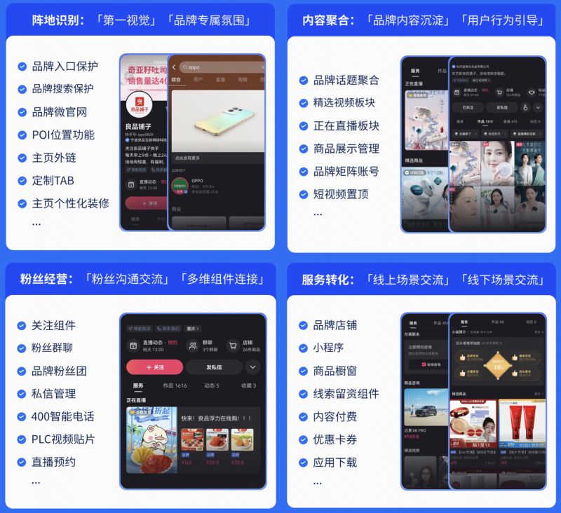 2022 年,快手品牌号进行了全新产品迭代。首先,基于品牌经营需求,快手品牌号完善了各项功能组件。在阵地识别、内容聚合、粉丝经营、服务转化方面,快手品牌号借助品牌店铺、小程序、商品橱窗等,实现线上场景交易、线下场景引流。