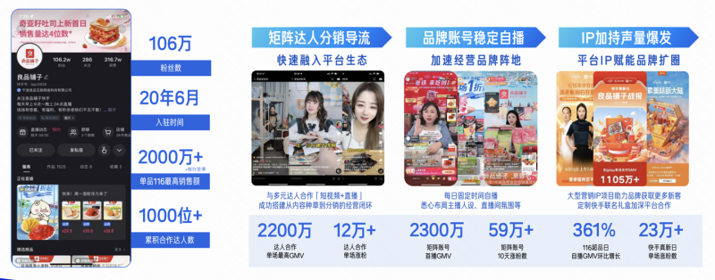 例如,良品铺子从快手品牌号建设出发,注重品牌账号稳定自播,并悉心布局主播人设、直播间氛围等,加速经营品牌阵地。在矩阵达人分销导流和合作平台 IP 级营销加持下,良品铺子在快手收获从八千粉丝到单场 GMV 屡破千万的成绩。