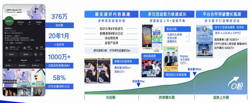 OPPO 在快手成长的每一步,都离不开账号运营和站内活动落地。在冷启期,OPPO 踏实做好内容基建,发布多种类型短视频收割用户好感;在持续增长期,OPPO 紧跟新品上市和促销节奏,以多元活动助力快速成长;在成熟上升期,OPPO 联手官方打造爆款活动,突破增长瓶颈。结合磁力引擎资源击破产品目标人群,OPPO 在快速涨粉的同时激活粉丝生态,达成 GMV 转化。