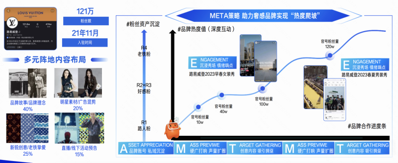 路易威登在 2021 年 11 月入驻快手,利用品牌故事、明星素材、新锐创意、活动预告等多元内容布局,倾情演绎奢品风尚,并抓住每一次时装周打造“云看秀”官方直播,持续渗透多元圈层,构建品牌阵地,收获超百万粉丝。
