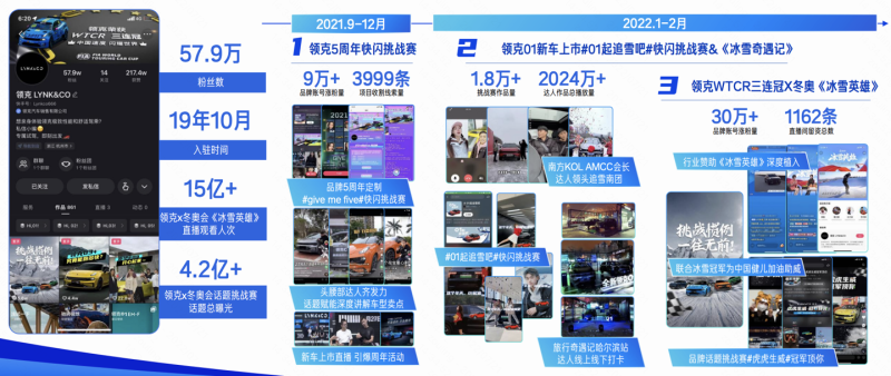 领克自 2019 年 10 月入驻快手以来,通过品牌账号自运营,以及合作垂类达人与站内活动,掌握了与老铁的交流密码,打通曝光-关注-互动-留资全链路,在快手跻身汽车厂商粉丝量 TOP5 行列。
