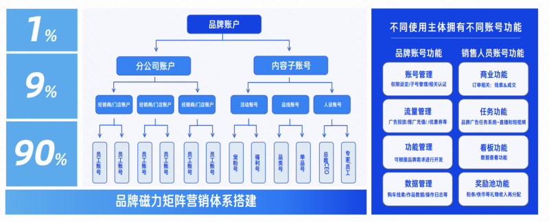 基于不同类型品牌,磁力矩阵以多元矩阵玩法激发品牌的新势能。例如,汽车品牌以主机厂为主账号,建立经销商子账号矩阵;快消品牌以功能号为主账号,建立人设号矩阵;3C 品牌则以集团号为主账号,建立不同品线子账号矩阵。