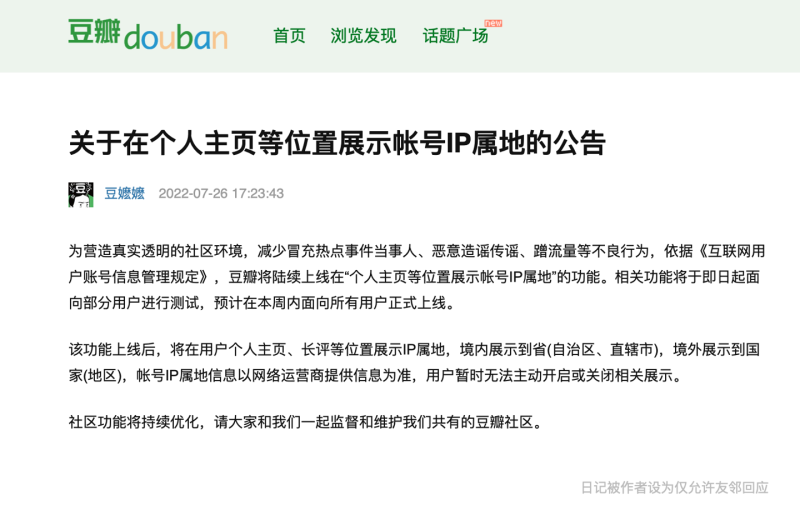 IT之家 7 月 26 日消息,今天,豆瓣官方发布公告,称为营造真实透明的社区环境,减少冒充热点事件当事人、恶意造谣传谣、蹭流量等不良行为,依据《互联网用户账号信息管理规定》,豆瓣将陆续上线在“个人主页等位置展示账号 IP 属地”的功能。