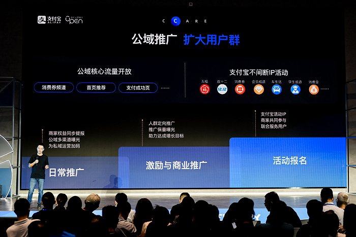“大家都知道支付宝公域导流强、五福和双12这类IP造节运营强,今年感觉不一样的是,产品在支付宝开放中的戏份越来越大。而且这一轮产品开放后,支付宝公域导流私域基本串在每条产品链路里了。”一位参会多年的服务商察觉到了新的信号。