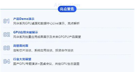 同时,现场也将深入探讨国产GPU在数据中心领域的突破,包括已批量应用的“风华1号”产业化成果,以及未来风华系列GPU如何在各种计算及渲染数据中心和终端领域赋能国产生态;会议设有演示体验室和高管面对面洽谈室,可结合客户需求,高管面对面探讨GPU应用合作和GPU SoC芯片定制,一起解决痛点,共赢未来,打造国产GPU生态新格局。