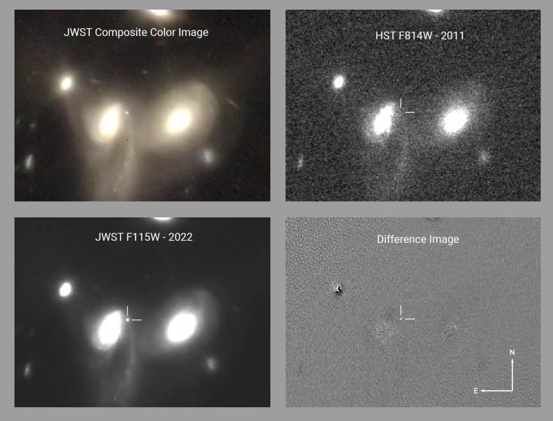 詹姆斯-韦伯发现超新星的星系在30到40亿光年之外。因此,我们看到的差异是30到40亿年前发生的爆炸的缓慢消退的光。当一颗恒星死亡并发生超新星时,整个事件在几分之一秒内发生。不过,由此产生的火球可以增长和变亮。