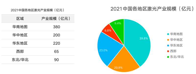 截止到2021年底,按中国各地区激光产业规模来看,华南仍规模最大的地区,产值达到380亿元,产业规模占全国39.8%,产业企业数量占全国30%以上。其中广东将激光作为未来重点发展产业,目标到2025年,广东省激光产业规模持续保持在全国领先地位,年营收超1800亿元,年均增长超15%。