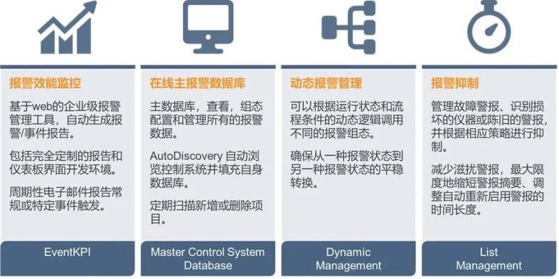 艾默生在报警管理咨询、技术服务和数字化报警管理工具上拥有较为完整的解决方案。下图简单介绍艾默生AgileOps报警管理平台的4个主要功能模块,包括报警性能监控EKPI、主报警数据库MCSD、动态报警管理DM和报警抑制管理LM。