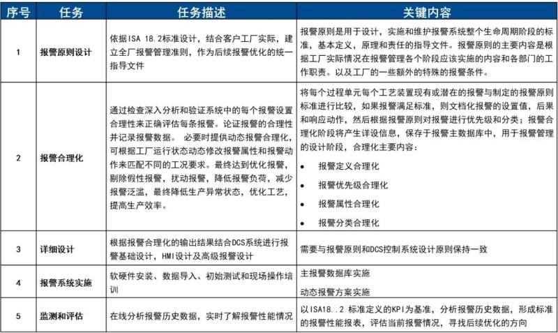 在全生命周期模型的10阶段,实施报警管理最主要任务有如下表五部分: