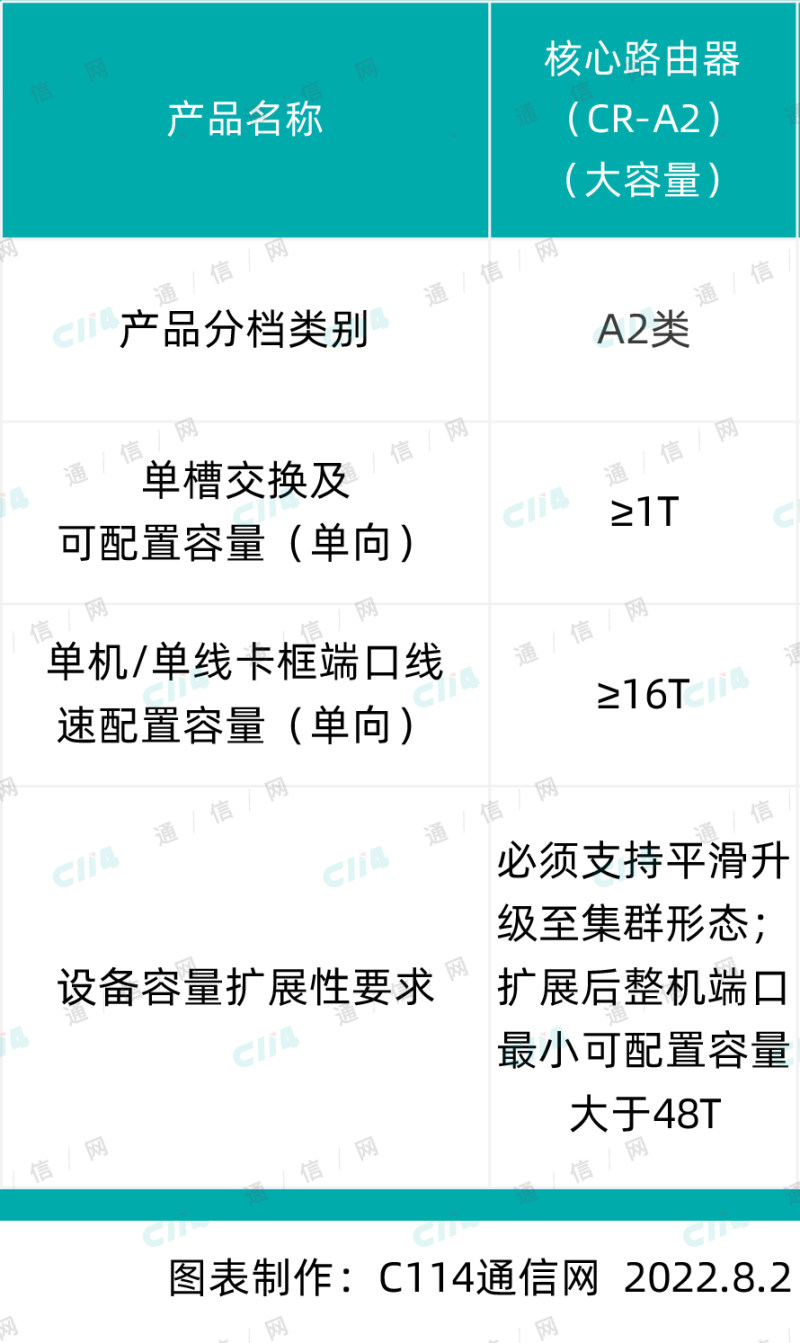 据中国电信发布的集采公告显示,本次共采购1台大容量核心路由器(CR-A2)。投标人的投标产品应符合中国电信相关技术要求,并满足以下分档标准及关键技术指标: