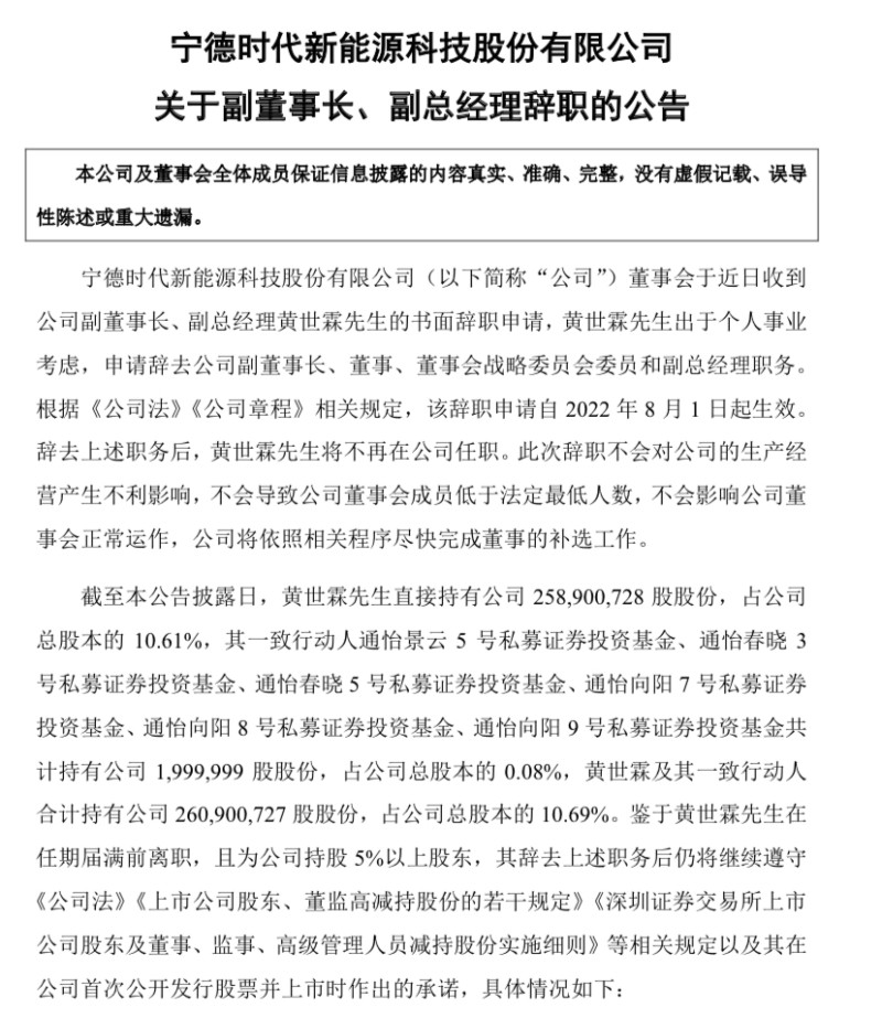 周佳接任副董事长职位后即意味着他不再负责公司具体业务的管理工作,由公司创始人曾毓群接过帅印,将董事长、总经理两大职务内外一肩挑,而宁德时代二当家黄世霖这次的辞职近乎于“裸辞”。