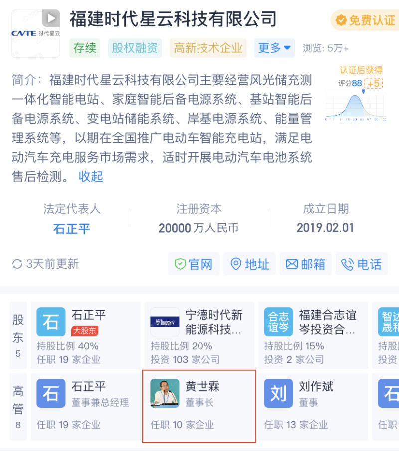 天眼查显示,黄世霖在时代星云任董事长一职。第一财经记者针对黄世霖是否会将事业重心转移至时代星云的问题咨询宁德时代,内部人士表示具体离职后情况需黄世霖本人回应。