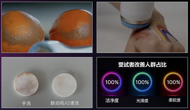 发布会中关于橙子、彩绘、粉扑的对比实验视频体现了LumiSpa iO一如既往的清洁力;果冻、鸡蛋对比实验视频,进一步展示其温和清洁、柔软亲肤的特质;经受试者体验后数据结果显示,大部分受试者在肌肤紧致度、光泽度、柔润度、光滑度、皮肤质地、痘痘肌改善等方面均取得良好效果。