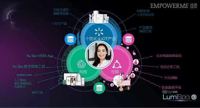 如新预计将投入超过5亿美元,彻底重构品牌科技能力,在数字化社交生态系统中打造端到端的无缝体验。为此通过收购社交电商平台Mavely、数字巨头Infosys、与腾讯及阿里合作等措施引领 Nu Skin 走向数字化前沿。作为如新未来3–5年的发展战略,EMPOWERME从产品、科技和社群3个维度,全方位打造链接顾客,分享者和经营者的闭环生态系统,进而满足用户的个性化需求。