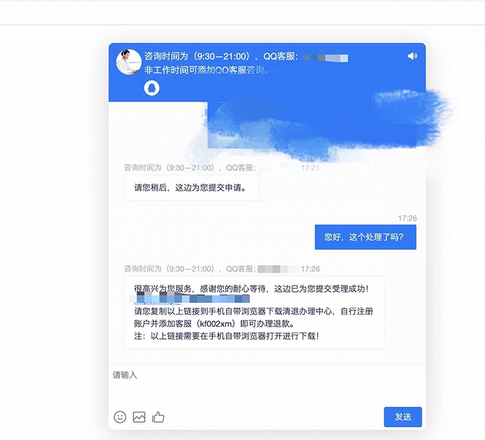 界面新闻记者进入公告上的“监管中心网址”后发现,该网址为一个白蓝界面的“在线咨询平台”。据一位曾联系过该“在线咨询平台”的每日优鲜供应商提供的界面显示,提出退款诉求的供应商被最终引流至一个名为“办理中心”的APP。当记者下载后,该APP界面一直显示“循环检测失败”,无法进行退款申请。