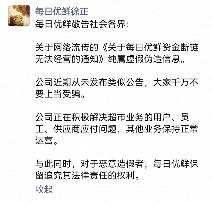 每日优鲜创始人徐正也在微信朋友圈辟谣称,网络流传的《关于每日优鲜资金断链无法经营的通知》纯属虚假伪造消息,公司近期从未发布过类似公告。