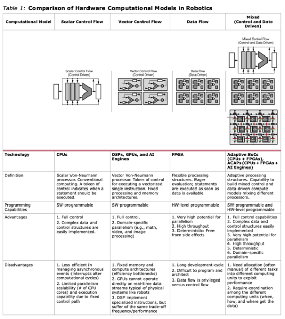 就实现而言,需要异构计算模型。这利用了CPU和GPU的优势,它们在控制流计算方面表现出色,同时利用FPGA的优势来处理数据流计算。这种方法同时提供了对CPU/GPU的灵活性和完全控制,以实现复杂的计算,具有低功耗、高性能、低延迟和硬件加速的确定性。现在,各种供应商都在提供自适应片上系统(SoC)和系统级模块(SOM)设备,例如AMD-Xilinx Kria™SOM及其相关的Kria机器人堆栈,它们提供了这种混合计算模型的优势.该表比较了这些不同的模型。