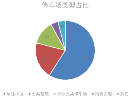 值得关注的是,当前各界在解决停车难时都只盯着公共停车场,但事实上,根据北京市交通委发布停车资源普查报告,停车场类型主要可分为以下五类:居住小区、公共建筑、路外公共停车场、路侧占道及其他,它们各自占比如下,可以看到,居住小区可停车位占比达到六成。
