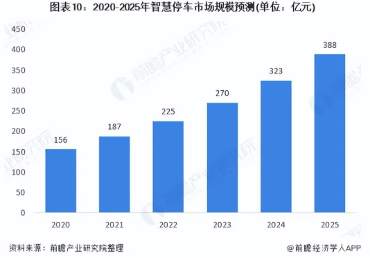 受政策鼓励与市场的迫切需求,智慧停车行业迎来蓬勃发展。据前瞻产业研究院初步预计,智慧停车市场规模在未来五年将保持20%以上的复合平均增速,到2025年有望接近400亿元。