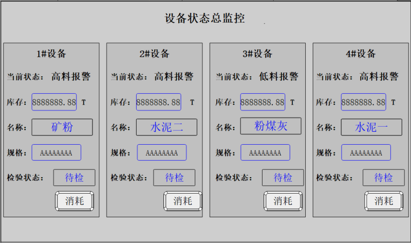 物料仓储,运输车向四个物料仓运输物料,根据运送物料,由现场触摸屏填写物料信息,然后由中控室10寸总控屏UH510给出确认信号,并保存此次物料信息。单个物料仓由设定时间及顺序打开仓储门禁加入物料。加入物料开启除尘装置,由主监控记录消耗,并将剩余显示到HMI上。