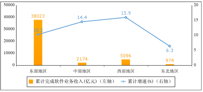 东部地区软件业务收入平稳增长,西部地区增势突出。上半年,东部地区完成软件业务收入38023亿元,同比增长10.2%,增速较1—5月份提高0.3个百分点;中部地区完成软件业务收入2174亿元,同比增长14.4%,高出全行业整体增速3.5个百分点;西部地区完成软件业务收入5096亿元,同比增长15.9%,高出全行业整体增速5个百分点;东北地区完成软件业务收入974亿元,同比增长6.3%,增速较1—5月份提高0.1个百分点。四个地区软件业务收入在全国总收入中的占比分别为82.2%、4.7%、11.0%和2.1%。