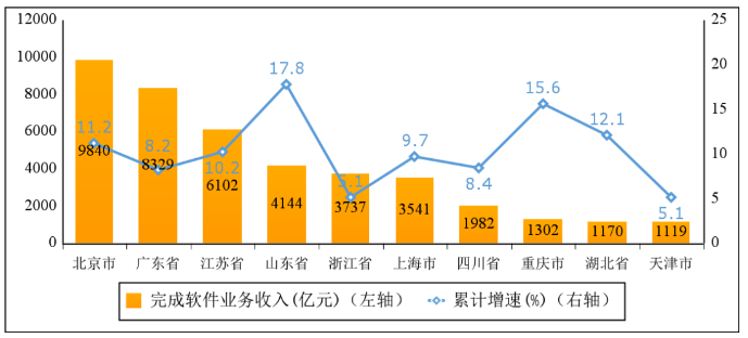 主要软件大省平稳向好发展。上半年,软件业务收入居前5名的省份中,北京市、广东省、江苏省、山东省、浙江省软件业务收入分别为9840亿元、8329亿元、6102亿元、4144亿元和3737亿元,分别增长11.2%、8.2%、10.2%、17.8%和5.1%,五省(市)合计软件业务收入32152亿元,占全国比重为69.5%,占比较去年同期回落0.4个百分点。