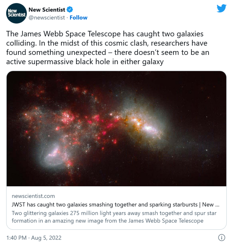 之后,碰撞通常会引起巨大的冲击波从而穿过碰撞的星系。然而当研究人员开始分析这两个砸在一起的星系时,他们发现这两个星系似乎都没有一个活跃的黑洞。该图像可以在上面《New Scientist》的推文中看到。