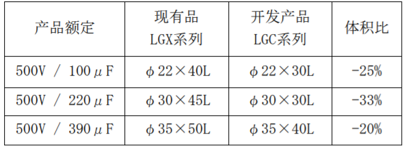 “LGC系列”采用了最新开发的大容量电极箔、耐久性卓越的电解液和电解纸,从而实 现了行业最小的产品尺寸。其结果,相比现有的“LGX系列”,体积比最大缩小33%,实现了小型化,非常适合节省空间的电路设计。
