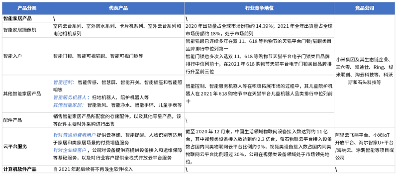 萤石网络的智能家居摄像机、智能入户等产品均属于家居安防产品的范畴。目前,中国智能安防企业包括传统安防龙头海康威视、大华股份,人脸识别独角兽依图科技、云从科技、商汤科技、旷世科技,以及高新兴、易华录、佳都科技等智能安防运营服务商。我国智能安防产业链涉及上游算法、芯片设计、以及存储器、图像传感器等零部件生产,中游软硬件及系统集成、或提供智能安防运营服务环节,下游主要应用于城市、家庭、以及学校、医院、轨道交通、金融等行业。